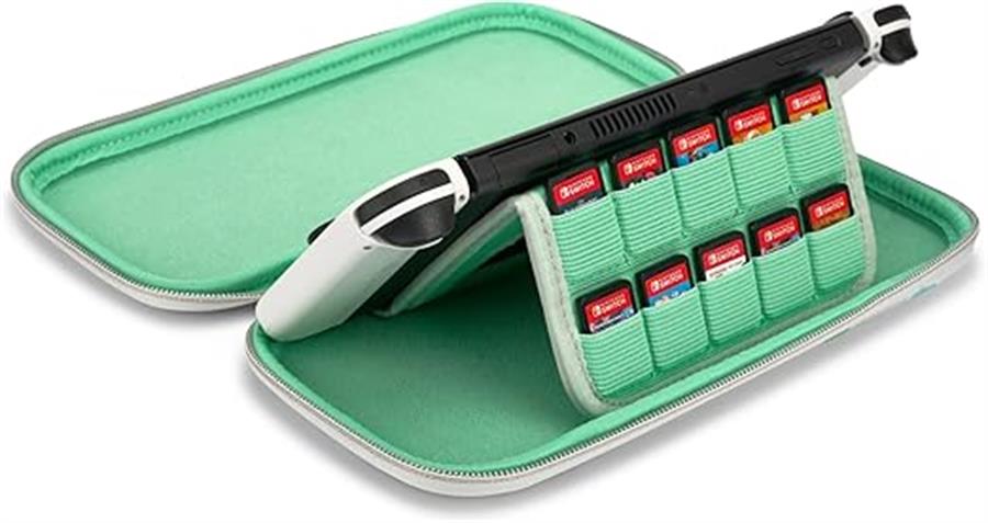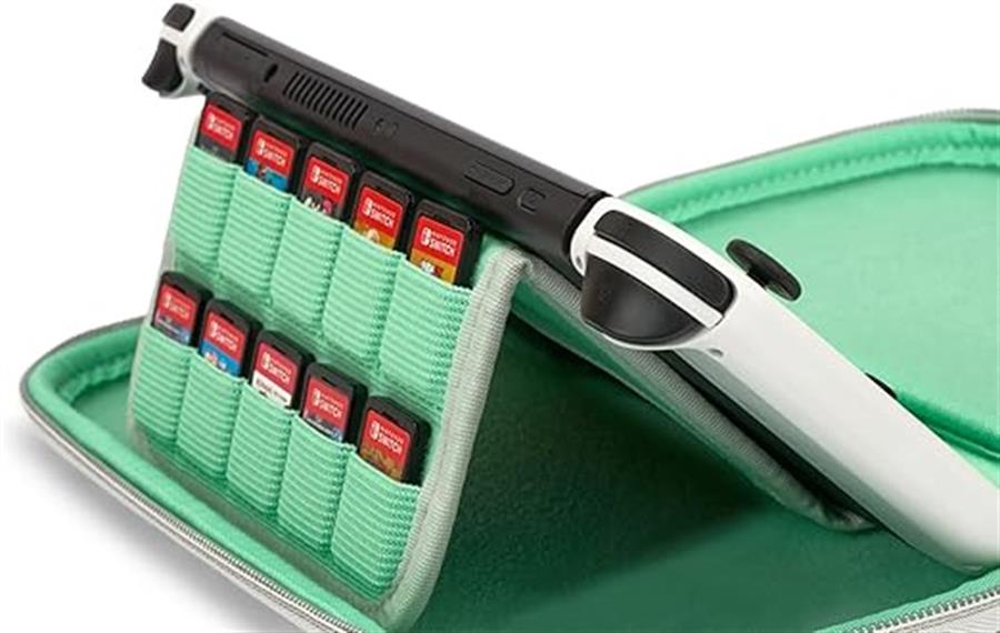 • La solapa protectora de pantalla acolchada incorporada incluye almacenamiento para nueve tarjetas de juego.