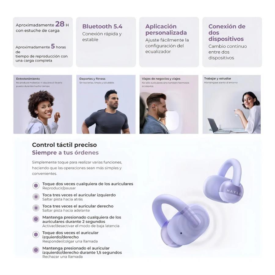 Los Haylou OW03 redefinen cómo se escucha, se siente y se vive cada momento con música. Su diseño clip-on open-ear te permite disfrutar del sonido sin aislarte del mundo — ideal para moverte, entrenar o simplemente estar presente y conectado.