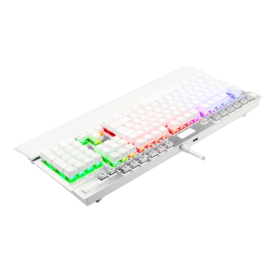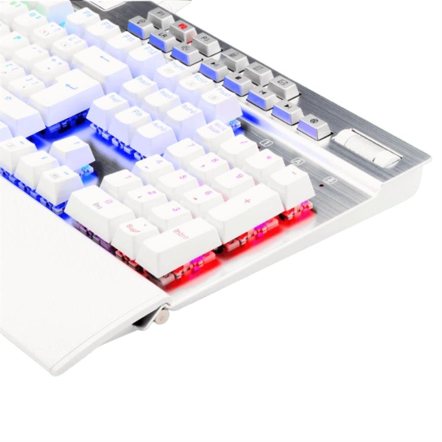 Este teclado en español tiene todo lo necesario: Marco sólido de aluminio para proveer durabilidad y estabilidad, rueda para controlar el volumen de aluminio y multimedia dedicadas, puerto adicional USB 2.1 Pass Through ubicado en la parte posterior del teclado, reposamuñecas desmontable y 12 teclas G completamente configurables.