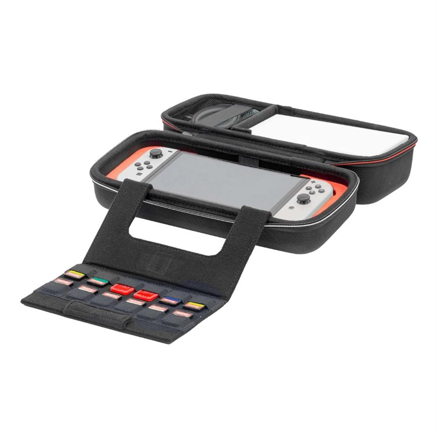 💼 Organización eficiente: Incluye espacio para consola y accesorios, además de una “Protection Library” que puede almacenar hasta 12 tarjetas de juego.