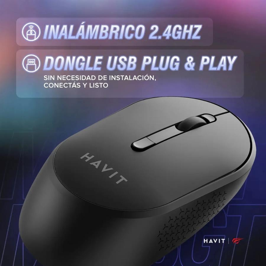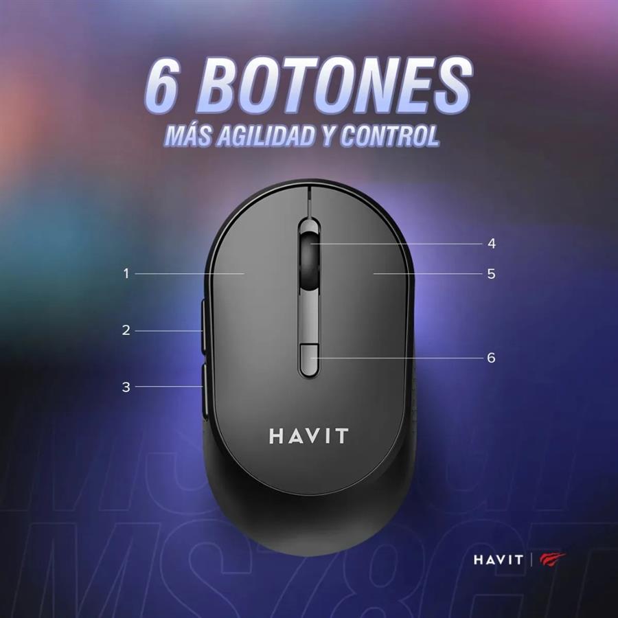 :: Mouse Inalámbrico Havit MS78GT 2.4GHz – Comodidad y Precisión para tu Jornada Diaria ::: Pensado para acompañarte durante horas de trabajo, sin distracciones ni cables. El Havit MS78GT es un mouse inalámbrico diseñado para oficina, home office y estudio, combinando precisión ajustable, diseño ergonómico y una experiencia de uso fluida que se adapta al ritmo de tu día. ¤ Conexión inalámbrica estable y sin interrupciones Gracias a la tecnología 2.4GHz, el MS78GT ofrece una conexión confiable en un radio de hasta 10 metros, con respuesta rápida y sin interferencias. Libertad total de movimiento para jugar o trabajar sin cables que molesten ¤ Precisión ajustable para cada tarea Con tres niveles de DPI (1200 / 2400 / 3200), podés adaptar la sensibilidad del cursor según el tipo de trabajo: movimientos precisos para tareas detalladas o mayor velocidad para navegación y multitarea ¤ Diseño ergonómico pensado para el uso prolongado Su forma compacta y equilibrada favorece una postura natural de la mano, reduciendo la fatiga durante largas jornadas frente a la computadora. Además, su diseño simétrico lo hace cómodo tanto para usuarios diestros como zurdos ¤ 6 botones que optimizan tu flujo de trabajo Incorpora 6 botones funcionales que mejoran la navegación y el control, ya sea en tareas de oficina, juegos o uso diario. Todo con una vida útil de hasta 3 millones de clics, garantizando durabilidad. ¤ Plug & Play, listo para usar No necesita drivers ni configuraciones: conectás el receptor USB y empezás a usarlo al instante. Funciona con 1 pila AA, optimizando el consumo para un uso prolongado