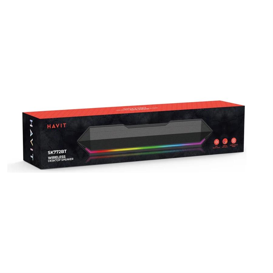 Barra de Sonido Inalámbrica RGB Havit SK772BT La barra de sonido Havit SK772BT combina potencia, conectividad y diseño moderno en un solo dispositivo. Ideal para mejorar la experiencia de audio en tu escritorio o setup gaming, gracias a su sonido estéreo, conexión inalámbrica BT 5.3 y una atractiva iluminación RGB. Características destacadas: Sonido estéreo potente de 10W Iluminación LED RGB integrada Diseño moderno y multifuncional Botón de volumen accesible Compatible con dispositivos inalámbricos y con conexión por cable Especificaciones técnicas: Versión inalámbrica: BT 5.3 Potencia de salida: 5W x 2 (10W total) Batería: 3.7V / 1200 mAh Tiempo de reproducción: hasta 4 horas (volumen medio) Tiempo de carga: 2 horas Conectividad: Inalámbrica, AUX, tarjeta TF, USB Ideal para quienes buscan una experiencia de sonido potente con estilo y practicidad.